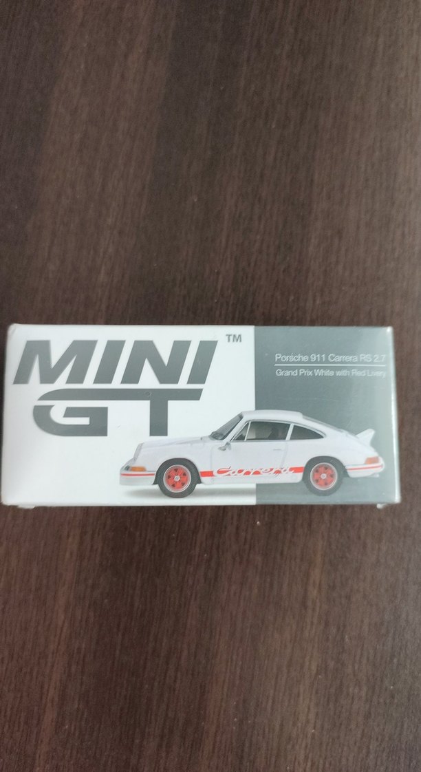 Mini GT'nin beyaz Porsche 911 Carrera RS 2.7 modeli, kırmızı tekerleklerle detaylı tasarıma sahip oyuncak araba.