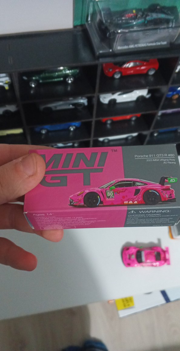 Koyu pembe renkte, Porsche 911 GT3 R 980 model yarış arabası oyuncak. Detaylı tasarım ve yarış çıkartmalarıyla.
