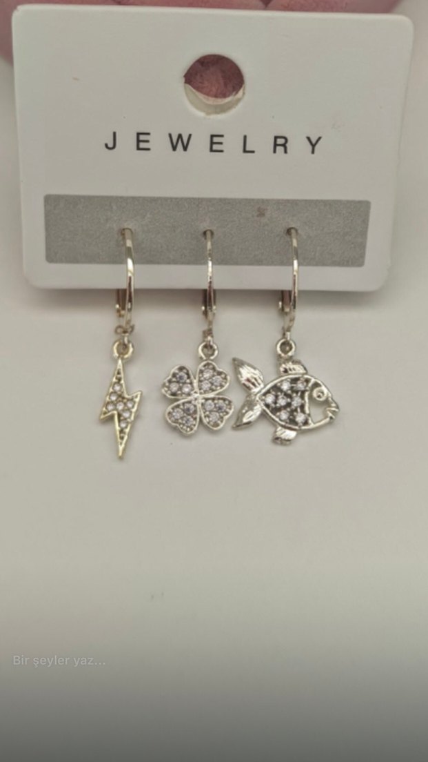 Gündelik kullanıma uygun, işlemeli payetli yıldırım, yonca ve balık figürlü mini gümüş renkli küpe seti. ⚡
