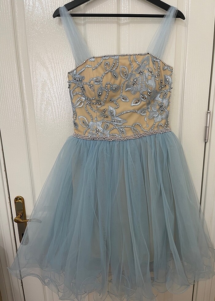 İşleme detaylı inci işleme omuz askısı tül straplez olarak da giyilebilir 1 defa kullanıldı defosuz