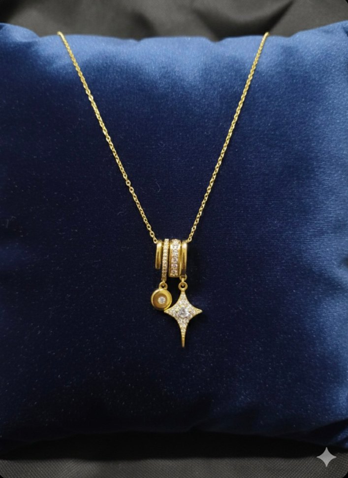 Kısa uzunlukta, işlemeli mini detaylara sahip altın renkli zincir kolye, günlük kullanıma uygun çağdaş ve göz alıcı tarz sunar. ✨