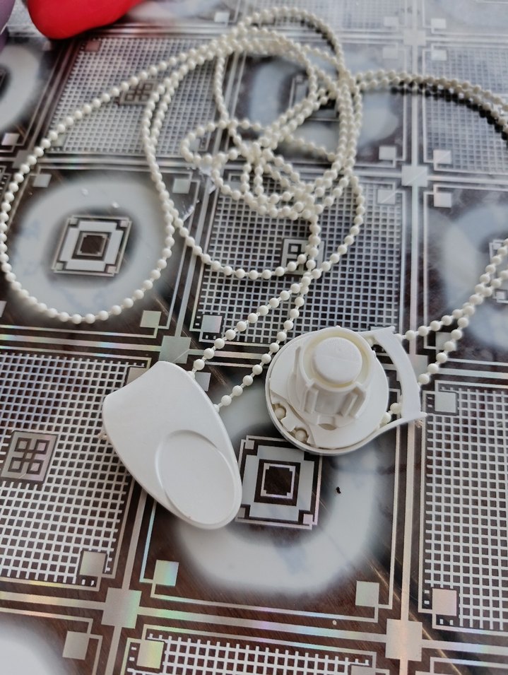 Gri ve beyaz baskılı, karşı kültür tarzında perde zinciri. Kolay ayar için boncuklu çekme mekanizmasına sahiptir.