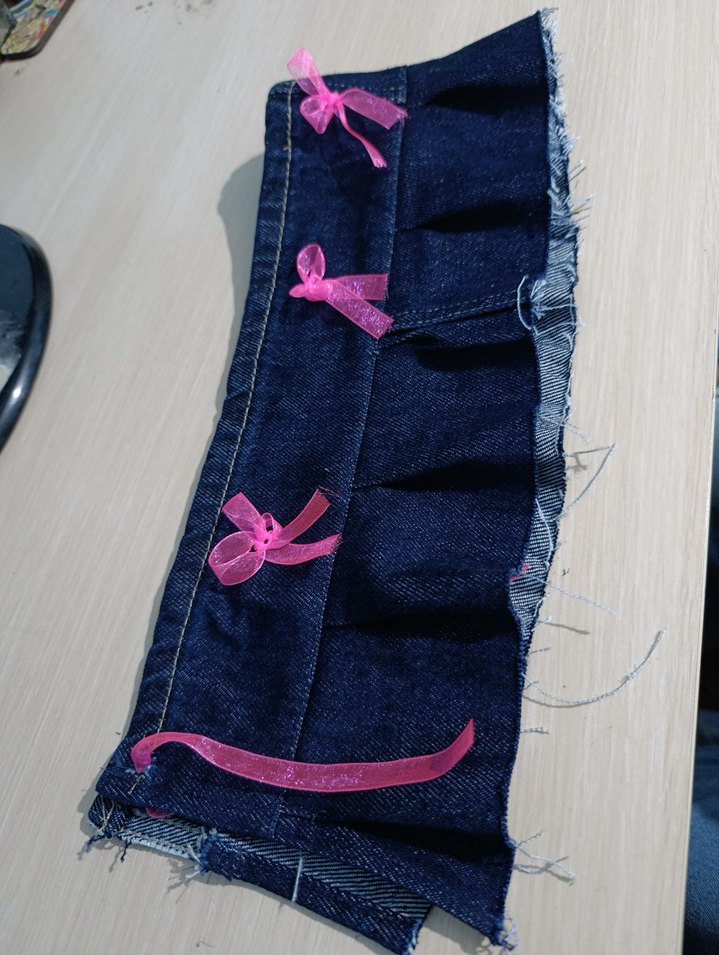 Renkli nakış detaylı, pembe kurdele süslemeli, fitted kesim kız kot eteği. ✨