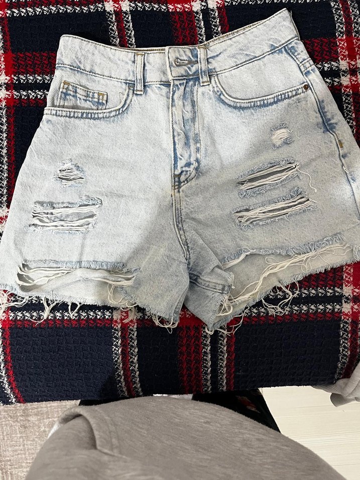mavi renkli, bol kesim kot şort, yırtık detaylı ve yuksek beliyle rahat ve şık bir görünüm sunar. Günlük kullanıma uygundur.