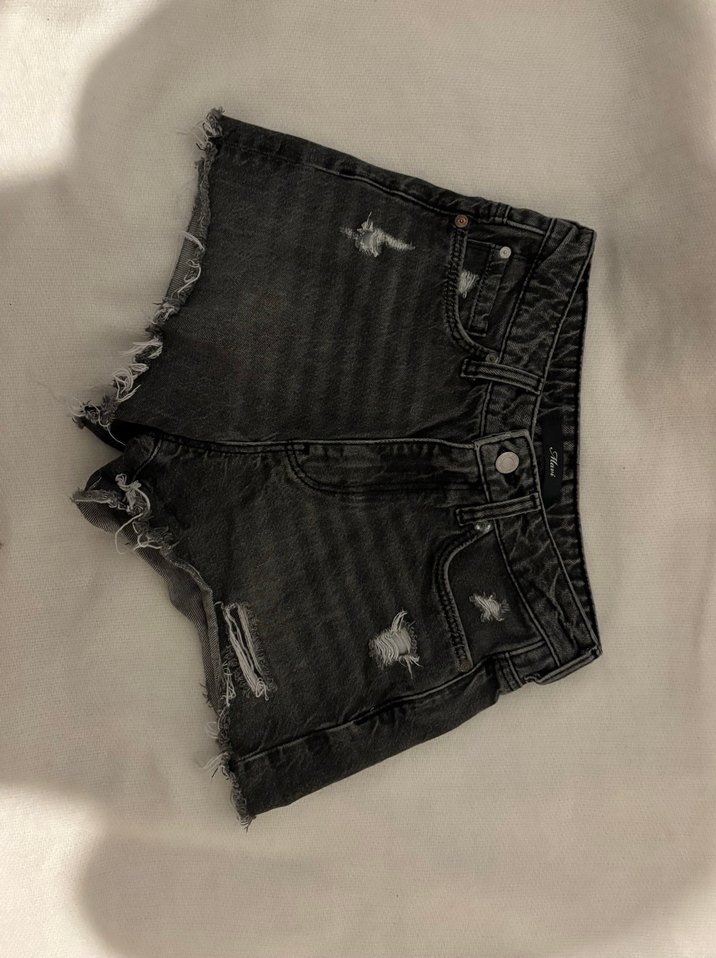 Siyah kot mini şort, bol kesim ve yırtık detaylara sahip. Grunge punk tarzında, günlük kullanım için uygun.