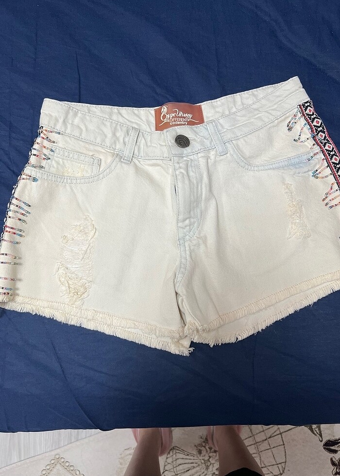 Yanları boncuklu krem kot şort önde ve arkasında cepleri vardır. Hiç giyilmedi