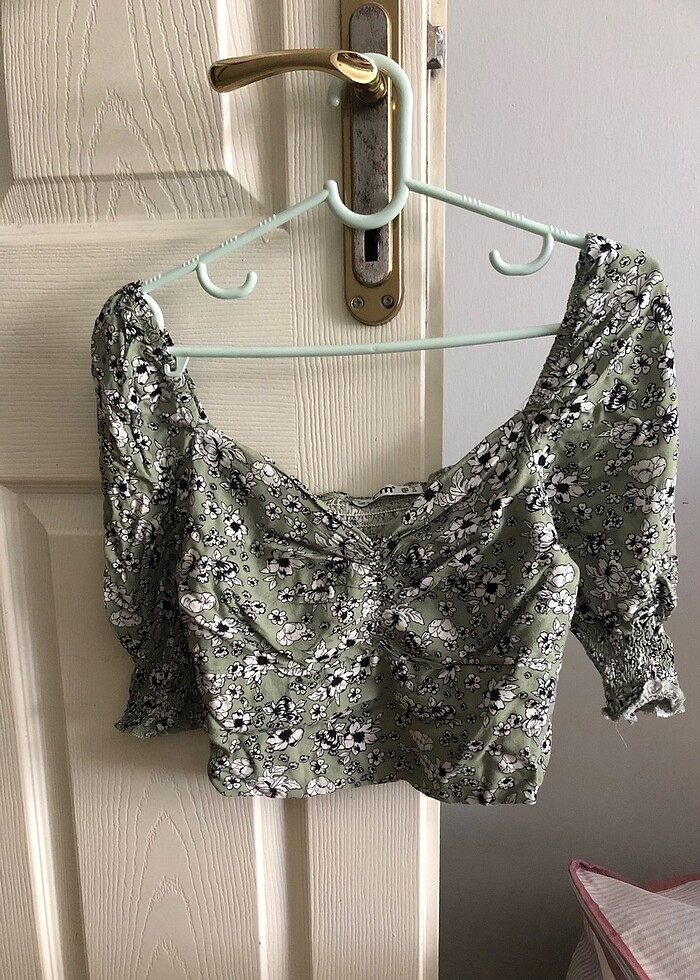 Bel kısmı ve kolları lastikli bir bluz krop da denebilir göbek üzeri . Bir kere giyildi tertemiz bel kısmının yanında fermuar var oradan giyilmesi kolaylaşıyor . Göğüs dekolteli