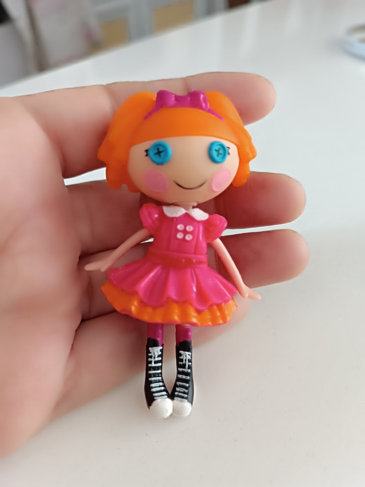 Renkli turuncu saçlı, mavi düğme gözlü ve pembe elbiseli minik bebek figürü. Siyah beyaz ayakkabılarla tamamlanmıştır. orjinal yurtdışı ürünüdür çoklu alımlarda lütfen ürün birleştirme isteyin