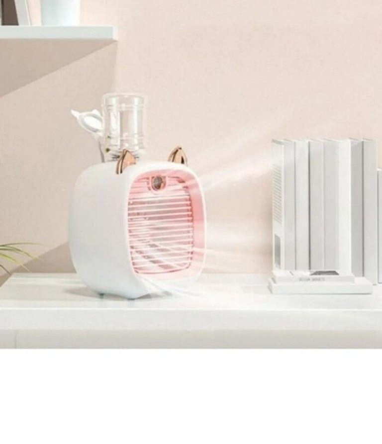 Pembe mini masaüstü fan, kompakt tasarım ve dekoratif metalik boynuzlara sahip, kolay kullanımlı düğmeler içerir. USB girişli. 1200 W Buharlı ❄️