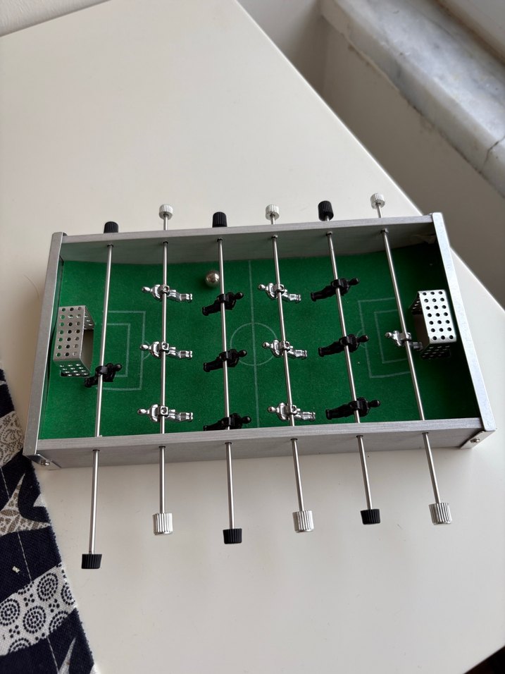 Bu mini masaüstü langırt seti, yeşil oyun alanı ve gri çerçeveye sahiptir. Siyah ve gümüş oyuncu figürleri ile masada oynanabilir.