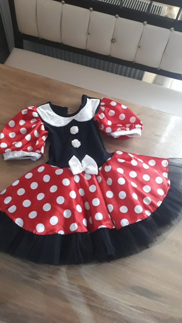Bu dar kesim kız çocuk elbisesi, renkli kırmızı ve beyaz puantiye desenine, kısa kabarık kollara ve tekne yakaya sahiptir. Oyuncu bir görünüm için fırfır detayları ve dekoratif fiyonk içerir.Dogum günu veya parti elbisesi olarak kullanılabilir.