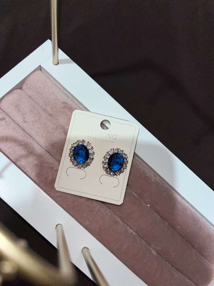 Mini boyda, koyu mavi taş ve etrafı küçük parlak taşlarla çevrili sıralı küpe, romantik akşamlar için uygun.