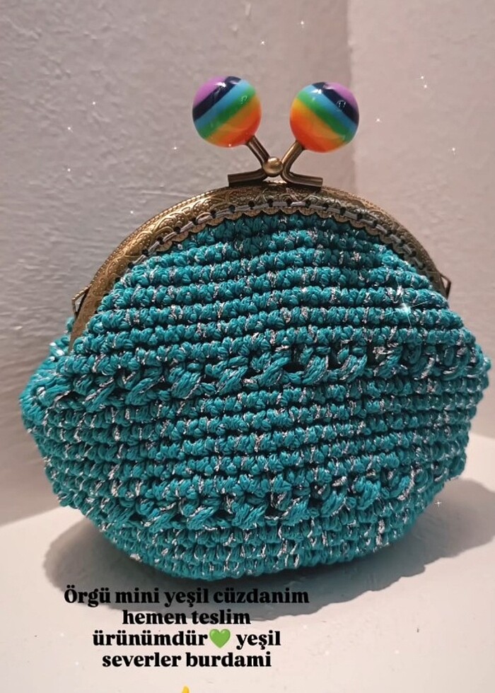 hazır mevcuttur. Yeşil simli ip ile örüldü.10 cm taban 14 cm genisl gonderilecek#orgucuzdan#minicuzdan