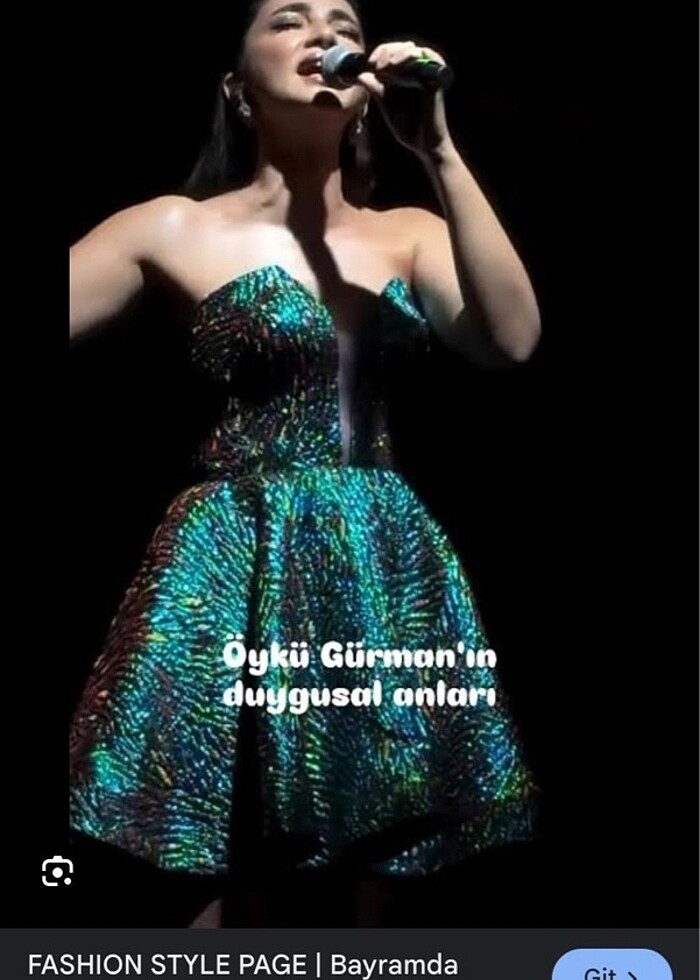KİRALIKTIR!!! 34 beden özel tasarım straplez yakalı turkuaz mini elbise. Parlak, desenli, sırtı ip bağlamalı. Öykü Gürman’ın sahne kıyafeti. İLETİŞİM BİLGİLERİ SON GÖRSELDE