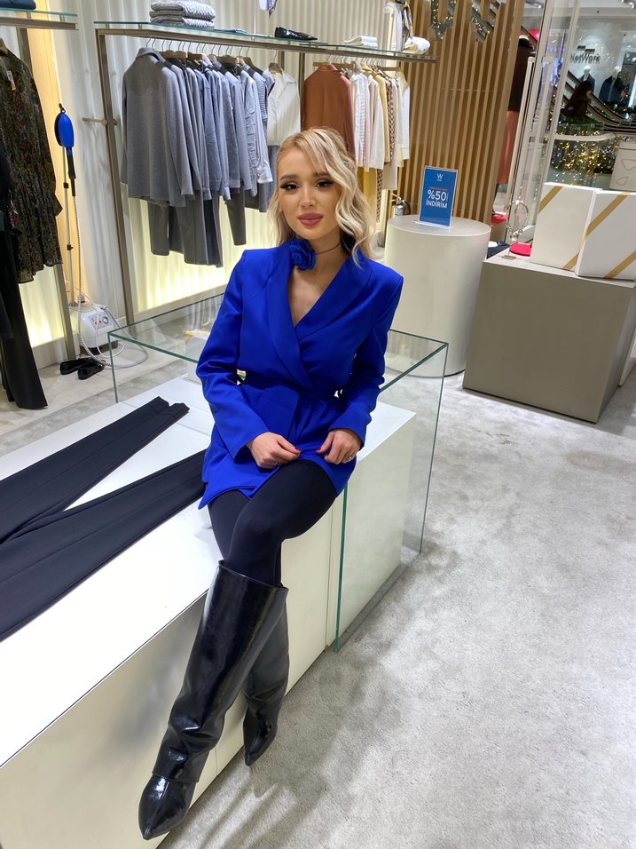 Parlak mavi yumuşak kumaştan yapılmış, kısa mini uzunlukta, kemerli detaylı kadın blazer. Notch yaka ve uzun kollu, ofis için cesur bir seçim.