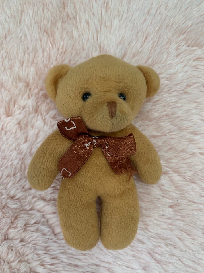 Pastel tonlarda yumuşak kahverengi peluş ayıcık, boynunda kahverengi kurdele ile. Temiz, sorunsuz. Hem oyuncak hem dekor olarak kullanılabilir. Anahtarlık haline de getirilebilir.