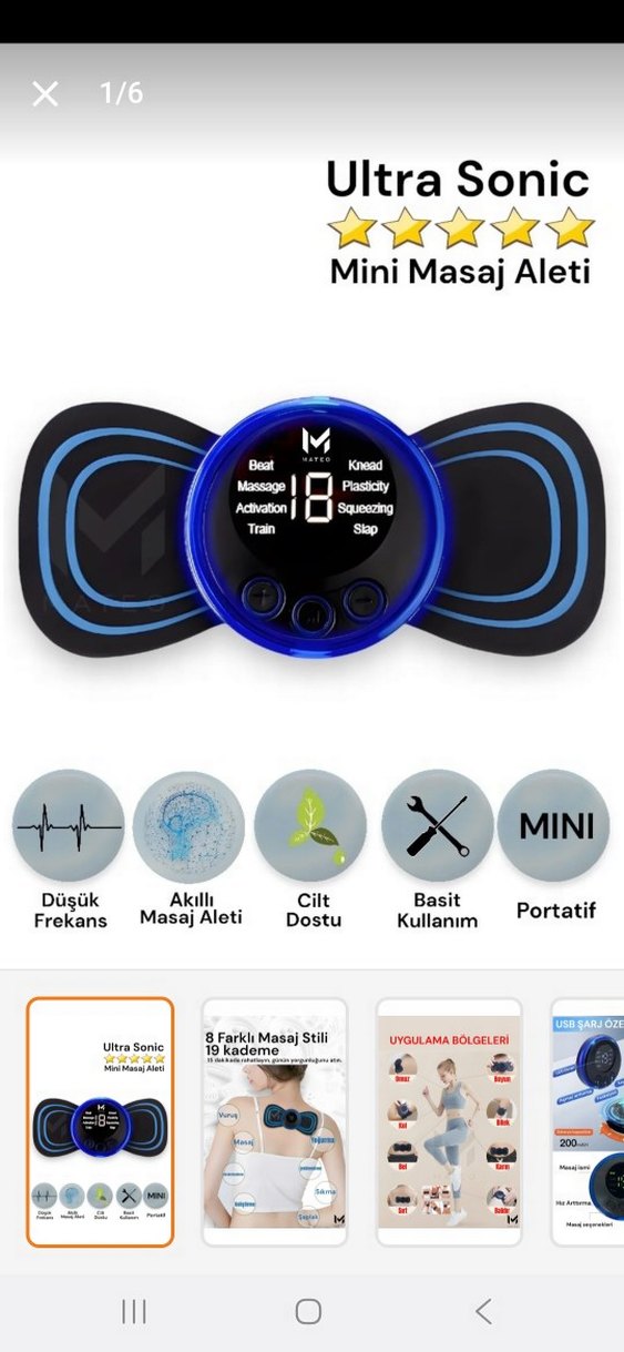 Koyu mavi renkte bu mini masaj aleti, 8 farklı masaj stili ve 19 kademe yoğunluk sunar. Portatif, cilt dostu ve kolay kullanımlıdır. Düşük frekanslı, akıllı masaj teknolojisine sahiptir.