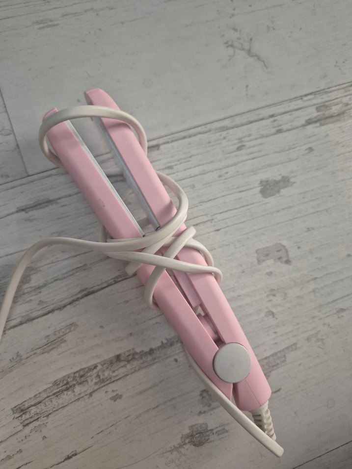 Pastel pembe renkli saç düzleştirici, düzgün plakalar ve kullanımı kolay beyaz kabloya sahiptir.