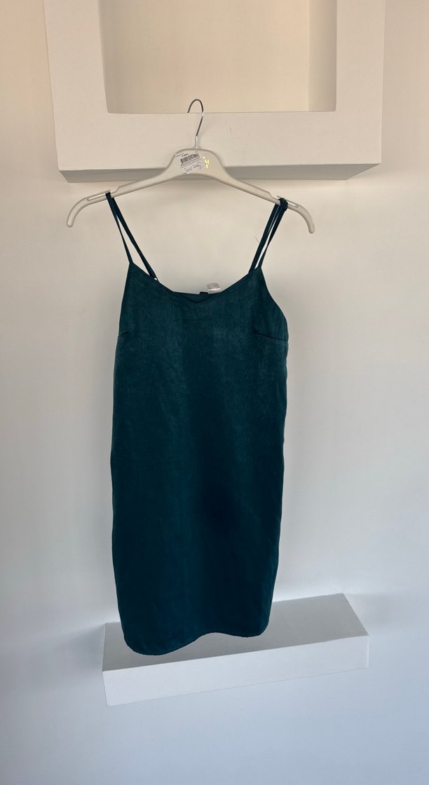 Kolsuz, siyah midi elbise, straplez yaka ve keten kumaştan. Minimalist ve normcore tarzıyla günlük kullanıma uygun, şık ve rahat bir seçim.