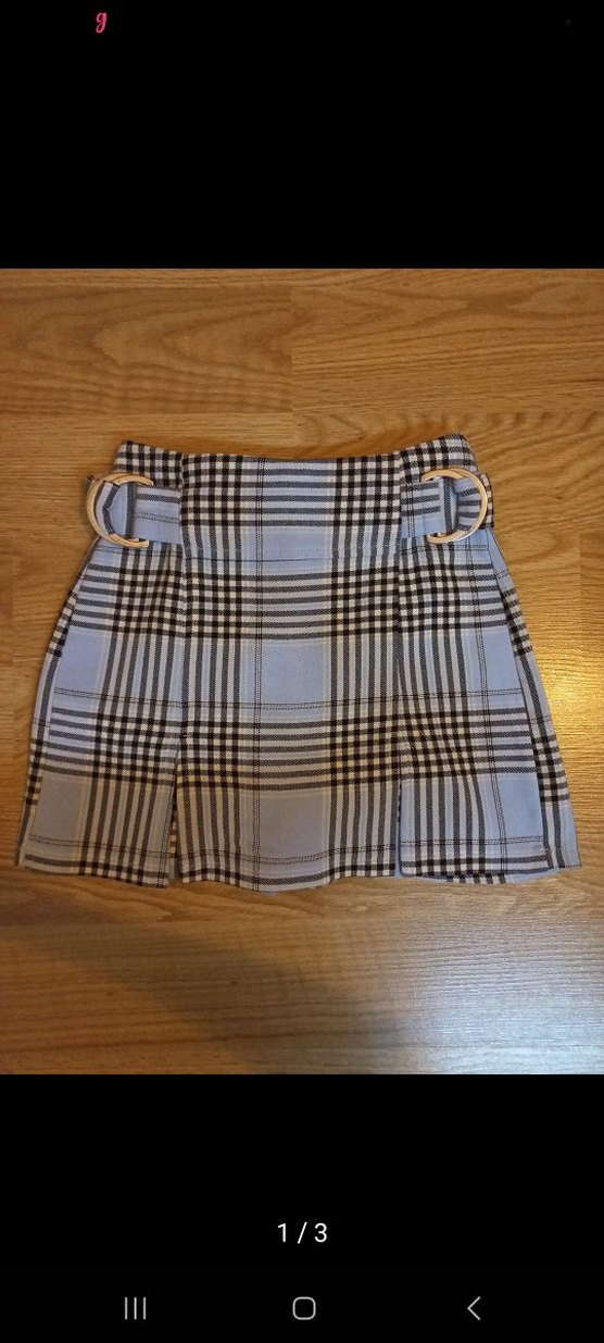 xxs beden uyumlu Tokalı detaylara sahip, mavi ve gri ekose desenli, sentetik kumaştan üretilmiş, dar kesim mini etek.
