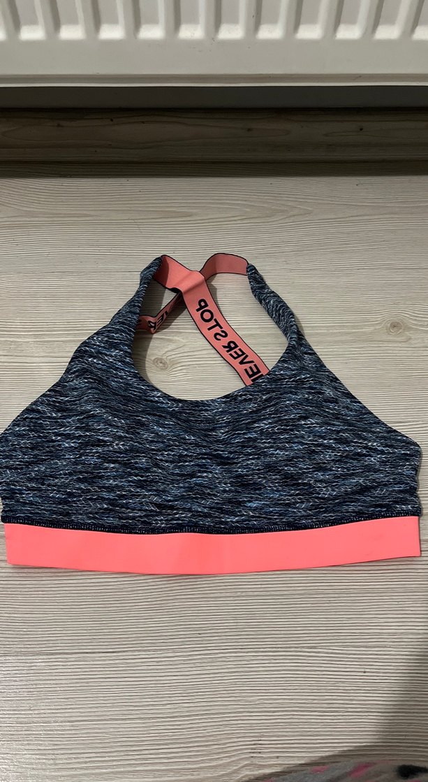Mavi desenli mini spor sütyeni, pembe elastik bantlı ve kısa kesimlidir.