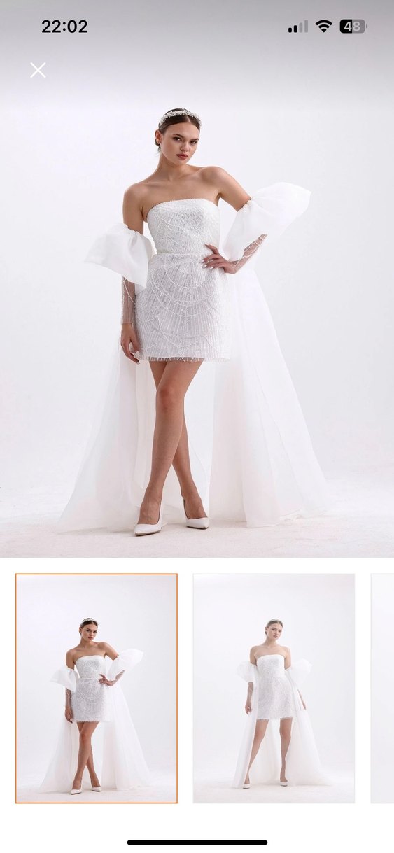Bu mini beyaz düğün elbisesi, straplez yaka ve şeffaf kabarık detaylı askılı kollara sahiptir. Çağdaş ve göz alıcı bir tarz sunar. ✨