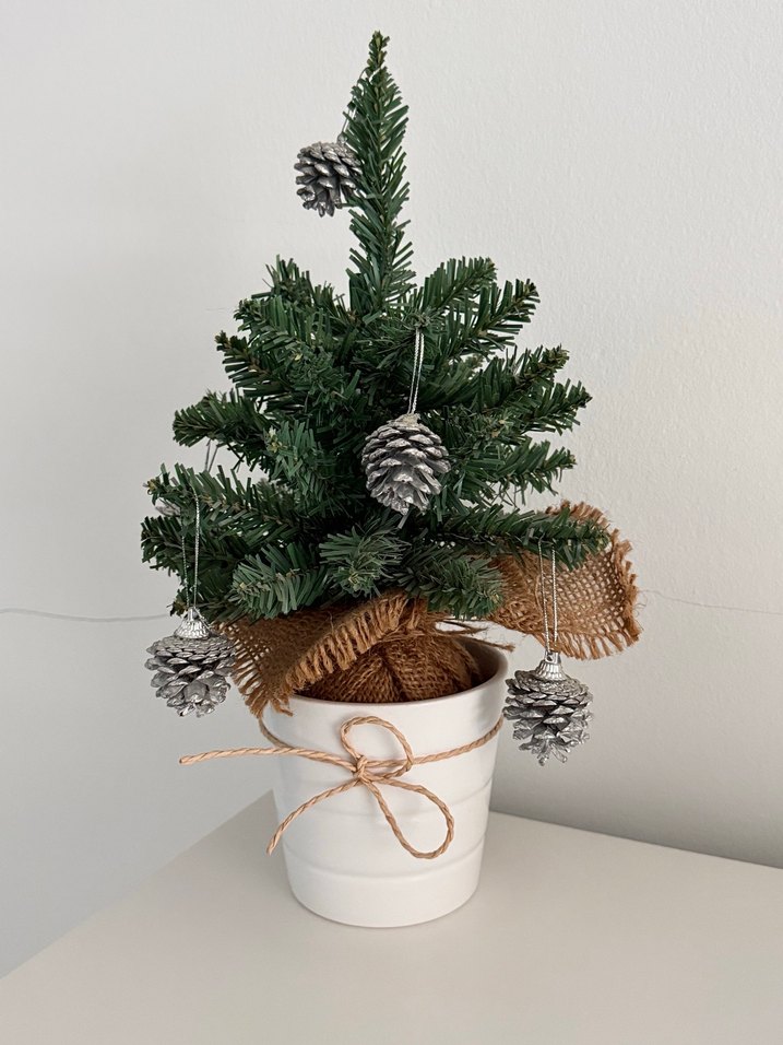 Küçük gri kozalak süslemeli ve jüt kurdeleli dekoratif çam ağacı kozalaklarıyla birlikte gönderilecektir ağaçta bauhaus markadır hiç bir kusuru yoktur saksısı ağaca ait değildir görsel amaçlı kullandım. çok şık bir dekoratif ancak ben ev mobilya ve aksesuar değişimi yapacağım için satıyorum