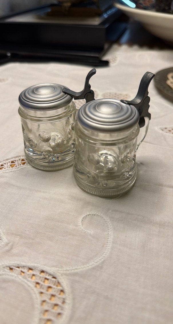 Kapaklı, gri metal saplı ve kabartmalı desenli küçük cam tankart. 2’li fiyat verilmiştir.İçecek servisinde kullanıma uygundur. ☕