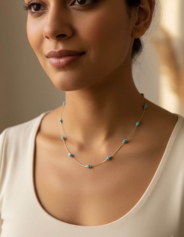 Kısa uzunlukta, ince zincir üzerinde eşit aralıklarla yerleştirilmiş küçük turkuaz boncuklar bulunan minimal ve şık günlük kullanım kolyesi.