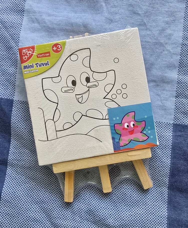 +3 yaş için mini tuval seti, beyaz zemin üzerinde eğlenceli denizyıldızı çizimi ve küçük ahşap şovalyeyle birlikte gelir.