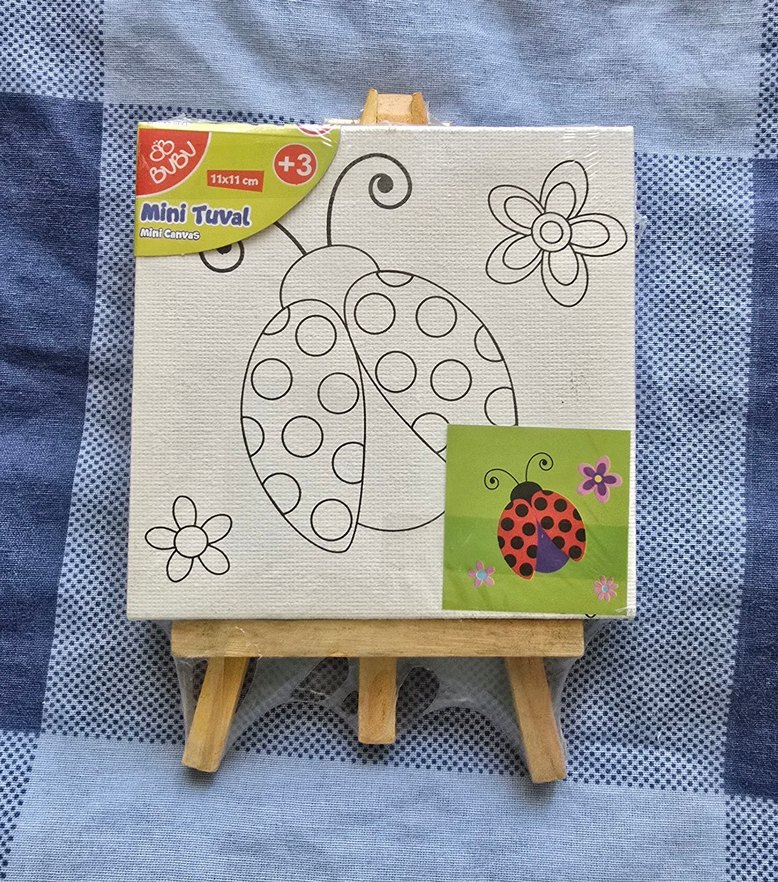 3 yaş ve üzeri çocuklar için mini tuval puzzle, uğur böceği ve çiçek desenli. Küçük ahşap ş easel ile birlikte gelir.