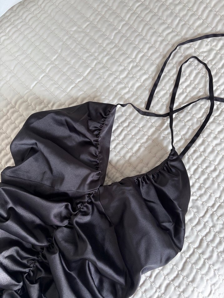 İnce askılı, V yakalı, kısa ve vücuda oturan siyah parlak herhangi bir kusuru yok kalıbı dar