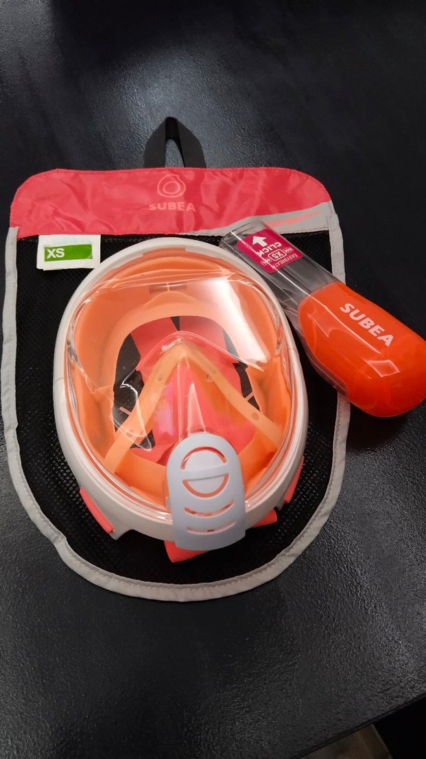 Turuncu renkli, baskılı ve sıkı oturan yüzücü maskesi, Velcro bantlıdır. XS beden ve kompakt taşıma kutusu mevcuttur. Pembe renk kız çocuk için sadece bir kez kullanıldı yarım saat.Etiketli yeni ♂️ #subea #decathlon
