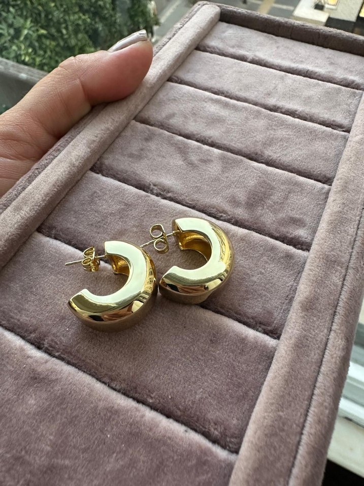 Parlak altın renk mini halka küpeler, zincir detaylıdır ve romantik akşamlar için uygundur. Kısa boy ve desensiz modern klasik tasarım sunar. ✨