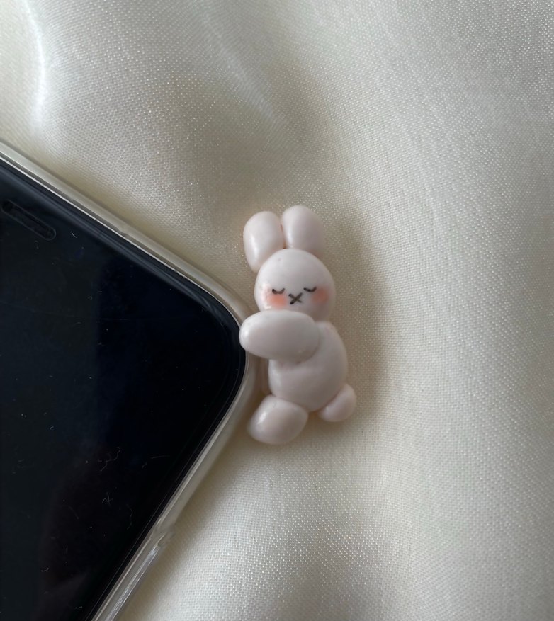el yapımı polimer kil minik tavşan telefon aksesuarı. Telefonunuzun köşesinde uyuyan bir tavşan düşünün