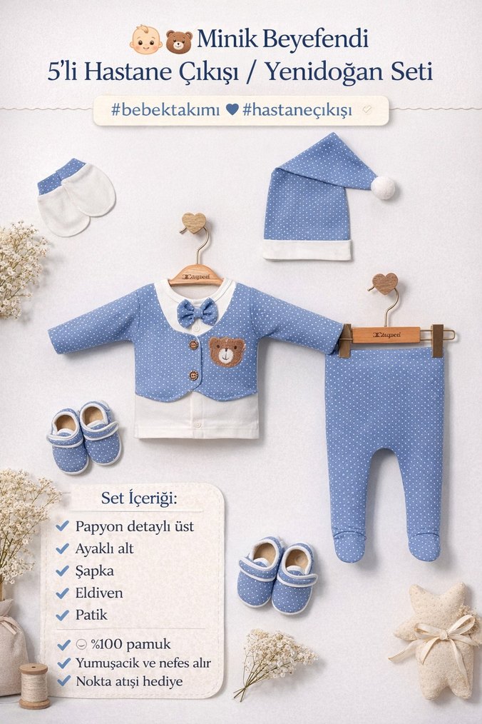 Pastel mavi renkli, pamuklu ve yumuşak örme kumaştan oluşan 5 parçalı yenidoğan hastane çıkışı seti. Papyon detaylı üst, ayaklı alt, şapka, eldiven ve patik içerir. Nokta atışı hediye ile birlikte.
