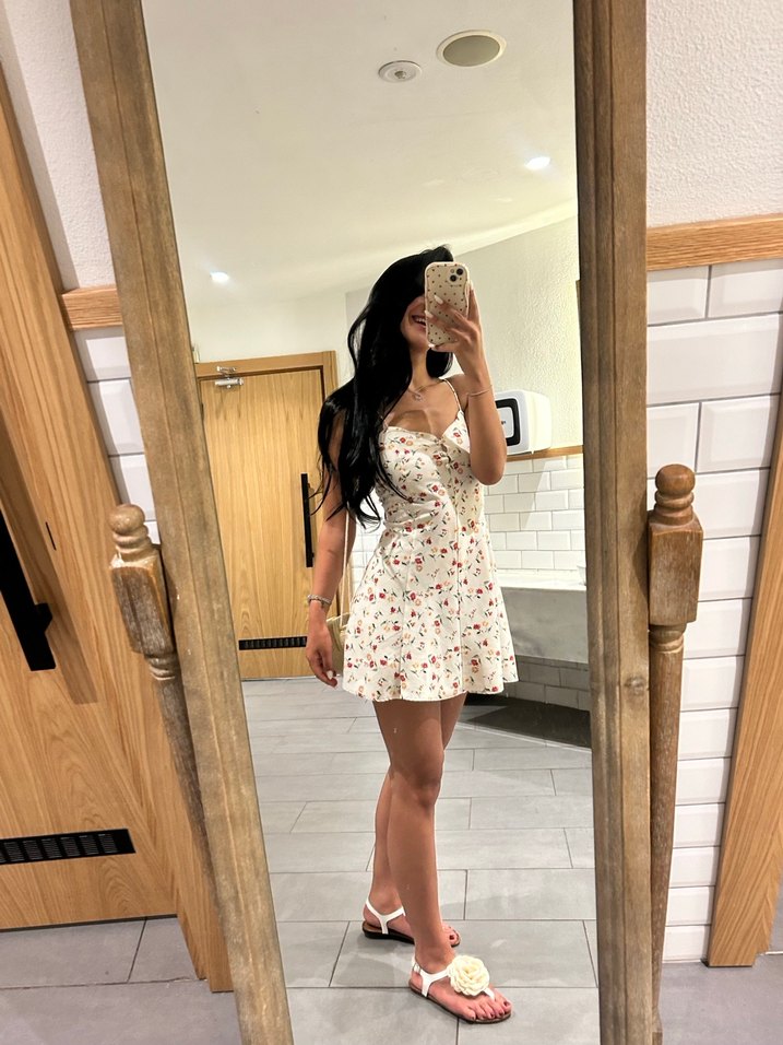 Çiçek detaylı, askılı beyaz mini elbise, baskılı desene sahip. Romantik akşamlar için hafif ve şık sokak tarzı elbise.