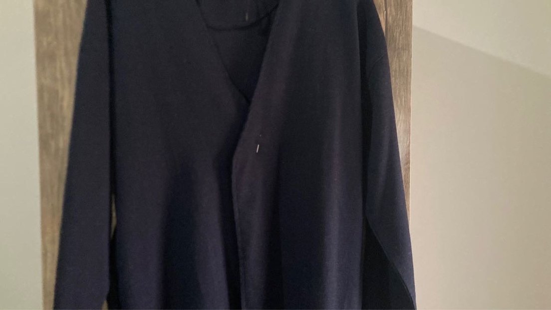 Siyah renkli, keten kumaştan uzun, bol kesim hamile kıyafeti. Notlu yaka ve yırtmaç detayı bulunur.