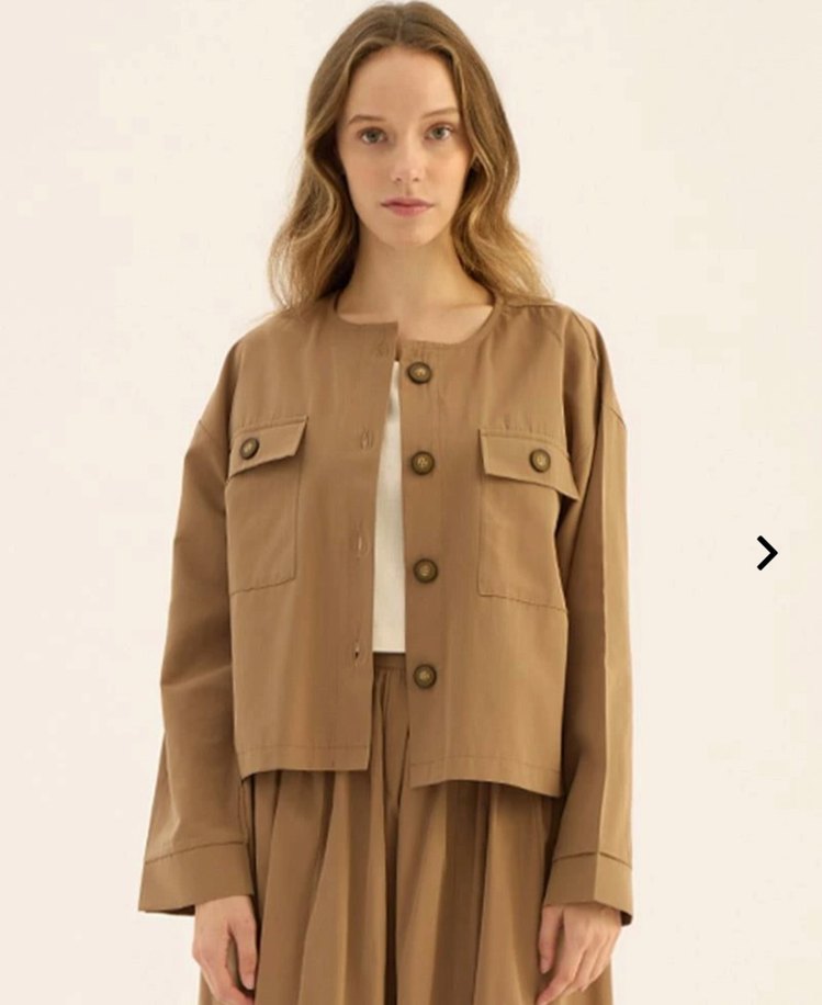 Düğmeli önü, keten kumaş ve uzun kollu, bej renkli bol kesim kadın ceket. Minimalist tarzda, günlük kullanıma uygundur.
