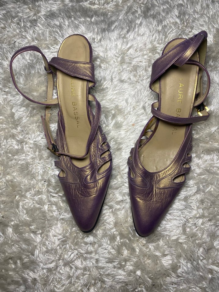 Mor parlak deri sarı yansımalı ve tokalı kayışlı minik topuk ayakkabı