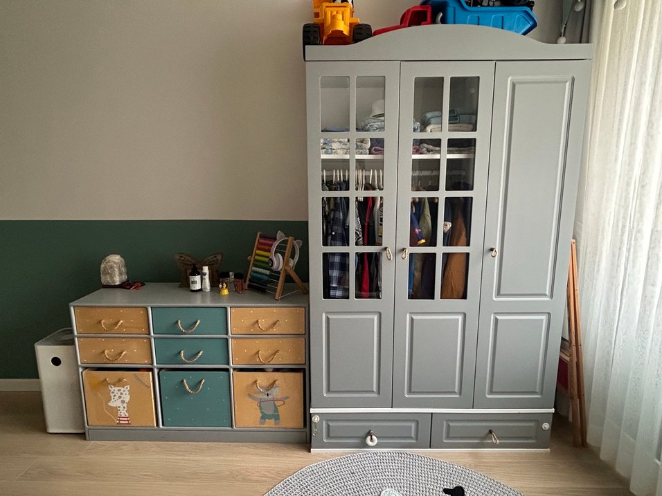 120x200 masif ahşap karyola İstikbal marka iç yatak ve yan yan yastıklar dahil. 6 çekmece 3 kutu el yapımı şekilli masif ahşap oyuncak dolabı. 3 kapaklı giysi dolabı, ayakları da mevcut. El yapımı toz tutmaz antialerjik halı ve el yapımı avize dahil. Odadaki tüm ürünler antialerjik ve kansorejen madde içermez. Giysi dolabi hariç hepsi özel yapımdır. Temiz ve sağlam ürünler. Nakliye alıcıya aittir takım fiyatı 60000 tl