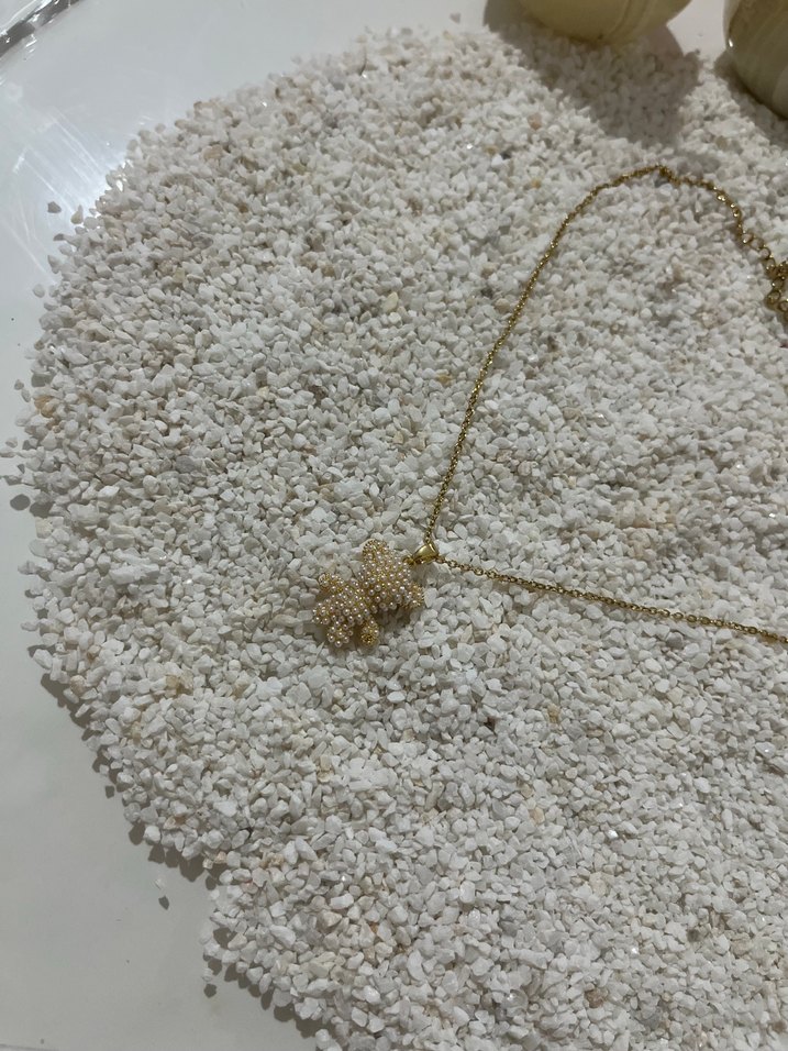 Uzun zincirli, altın renkli boncuk işlemeli ayıcık detaylı minimalist kolye, günlük kullanıma uygun.