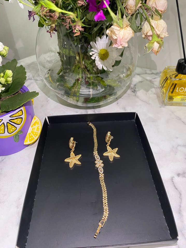 ✨ Deniz Yıldızı Detaylı Altın Renk Set ✨ Zarif ve göz alıcı deniz yıldızı figürleriyle tasarlanmış bu özel set, kombinlerine şıklık katmak için birebir. Küpe + bileklik olarak takım halindedir. • Altın renk kaplama • Şık ve modern tasarım • Günlük kullanım ve özel davetler için uygun • Hafif ve rahat kullanım • Hiç kullanılmadı, tertemiz Hem tek başına hem kombinle çok şık durur. ❗️İade kabul edilmemektedir.