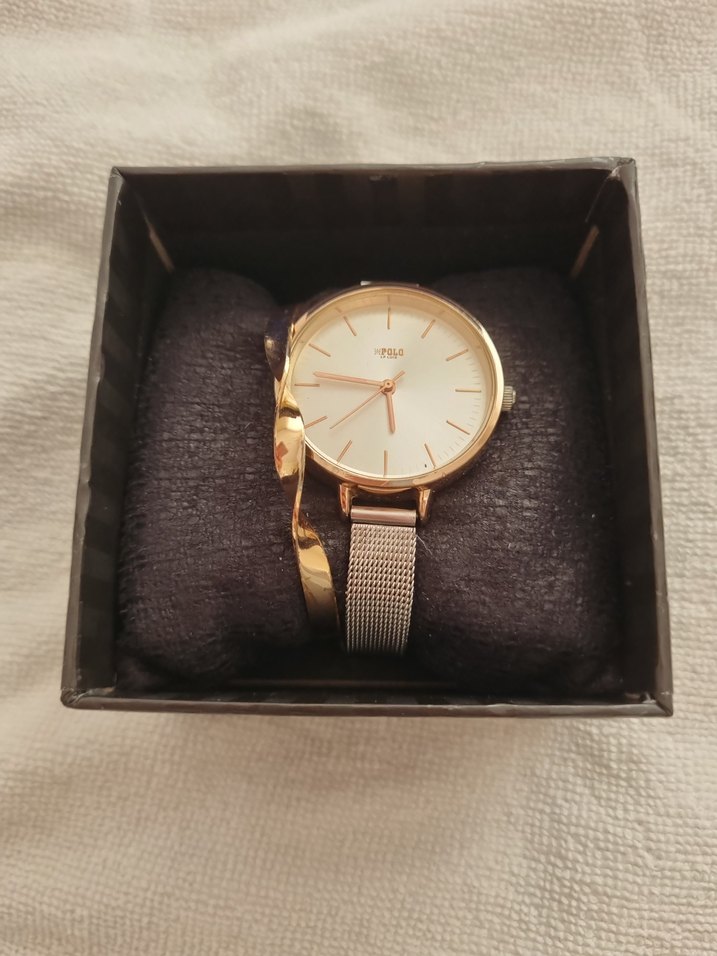 Parlak altın renkli, minimalist tasarımlı kadın saati, beyaz kadran ve kemerli file kayış ile trendy gündelik sokak stiline uygun. ⌚ çalışır durumda