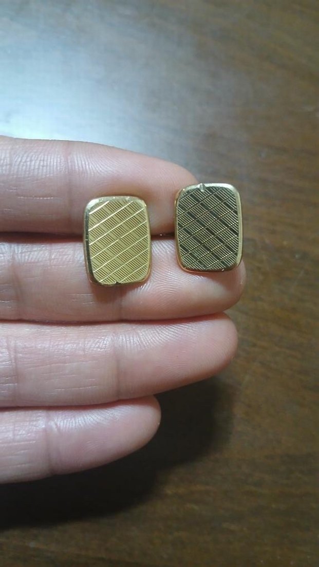 Parlak altın renkli, minimalist dikdörtgen tasarımlı erkek kol düğmeleri, çapraz çizgi desenleriyle klasik ve geleneksel tarzda. ✨