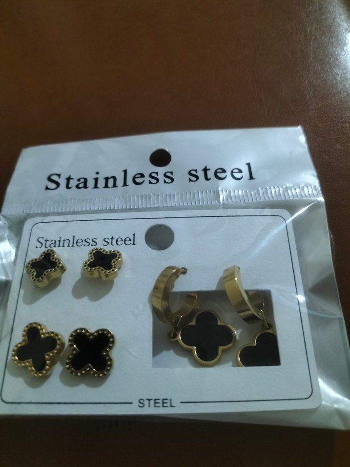 Minimalist tarzda, altın renkli, kısa uzunlukta ve işlemeli yonca desenli paslanmaz çelik küpe seti. Günlük kullanım için uygundur. ✨