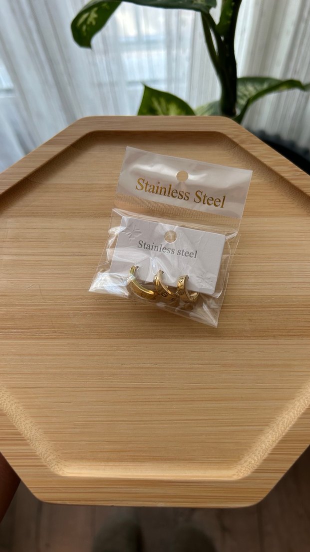 Paslanmaz çelikten yapılmış, parlak altın renkli minimal midi uzunlukta küpeler. Günlük sokak giyimine uygun sade tasarım. ️ Marka temsilidir