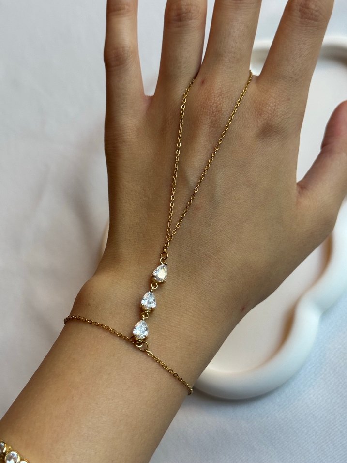 Minimalist tasarımlı, altın renkli zincir üzerinde üç şeffaf taş bulunan şahmeran. Düğün ve sade tarzlar için uygundur. ✨