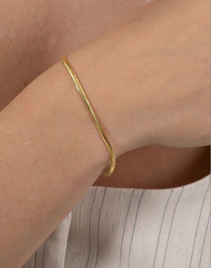 Parlak altın renginde, minimalist yılan desenli ve zincir detaylı bileklik, günlük kullanıma uygundur.