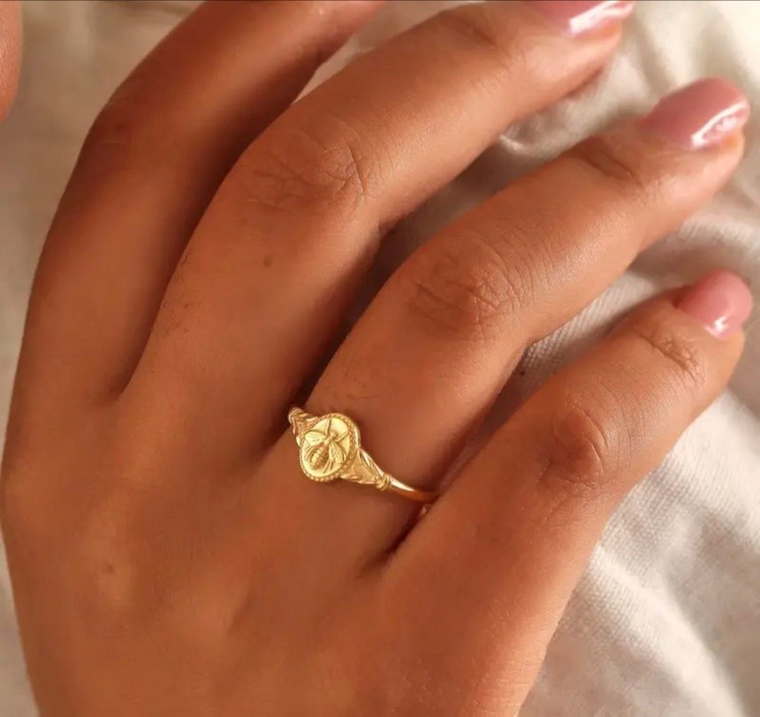 Parlak altın renkte, tokalı ve baskılı desene sahip kadın yüzüğü. Klasik zarafet ile bohem Paris tarzını günlük kullanıma sunar.